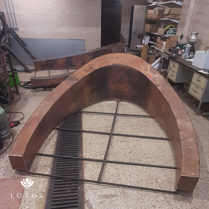 در این پروژه، دو قوس کناری ورودی اصلی، با ارتفاع 2.60 متر ساخته شده اند و با استفاده از ورقهای مس با کیفیت عالی، طراحی و اجرا شدهاند. انتخاب مس برای این حجمسازی، علاوه بر زیبایی بصری این فلز، به دلیل خواص منحصر به فرد آن در پایداری و مقاومت در برابر عوامل محیطی بوده است. تیم متخصص ما با بهرهگیری از دانش روز و دقت فراوان، فرآیند شکلدهی و نصب این قوسها را با بالاترین استانداردهای کیفی به سرانجام رسانده است.